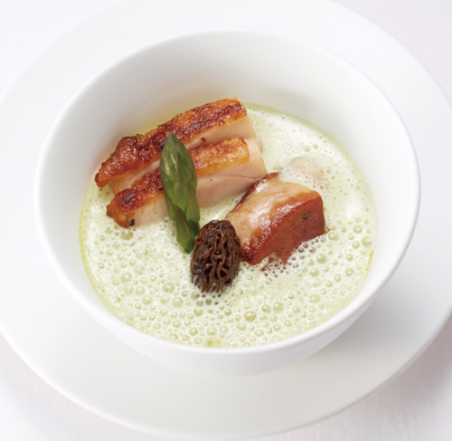 【グリーンアスパラガスのヴルーテ 四万十鶏とモリーユのロワイヤル フォワグラのポワレ】