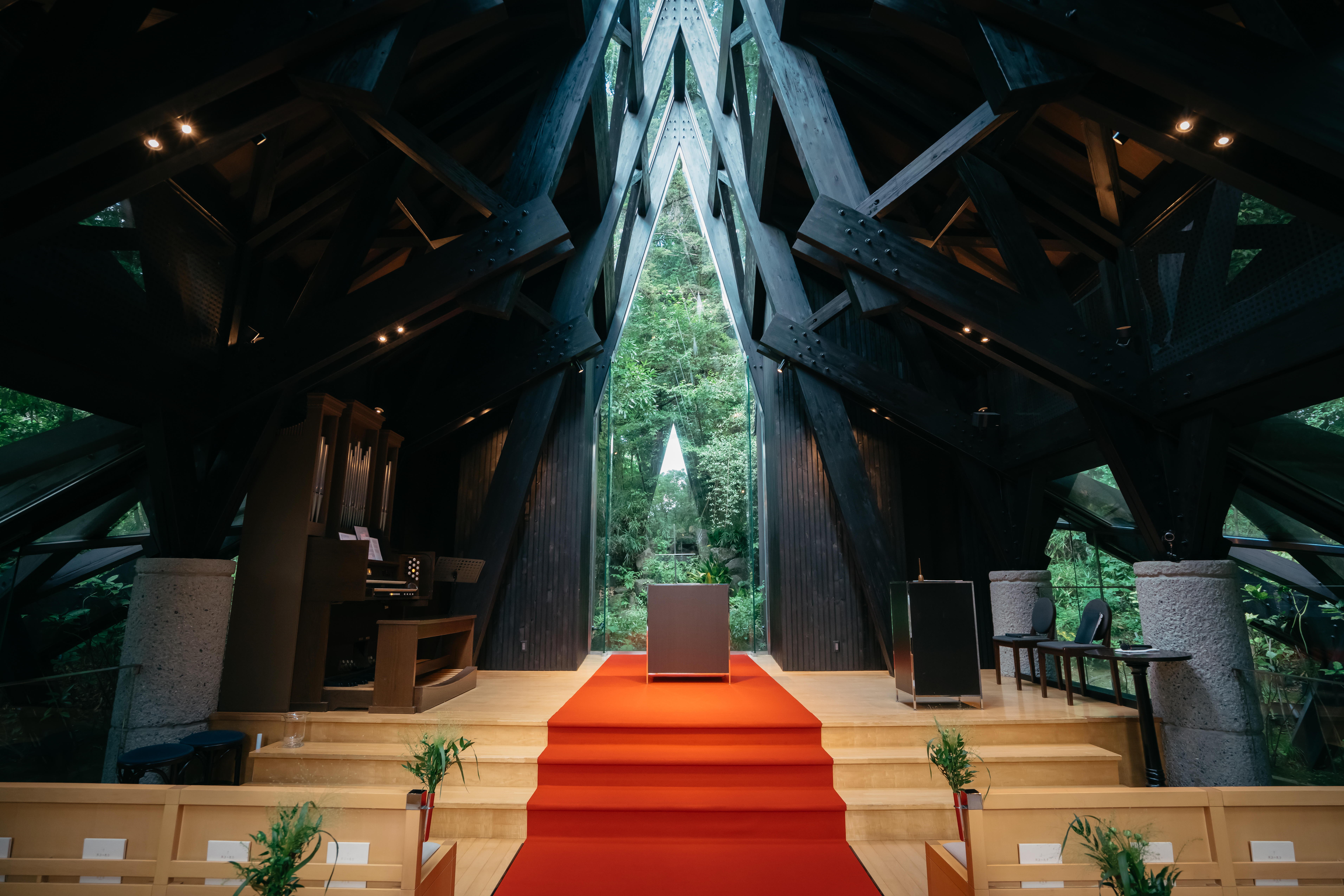 祭壇の奥にある大きな窓からは、豊かな緑がそのまま見え、 まるで森の中で挙式をしているような感覚になります。