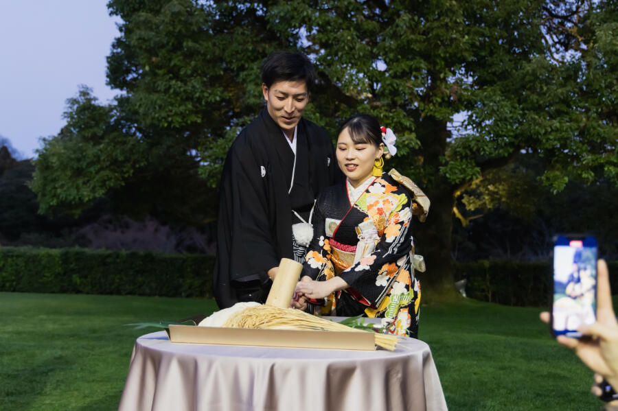 ガーデンでのお時間は和装ならではの演出で鯛の塩釜開き!